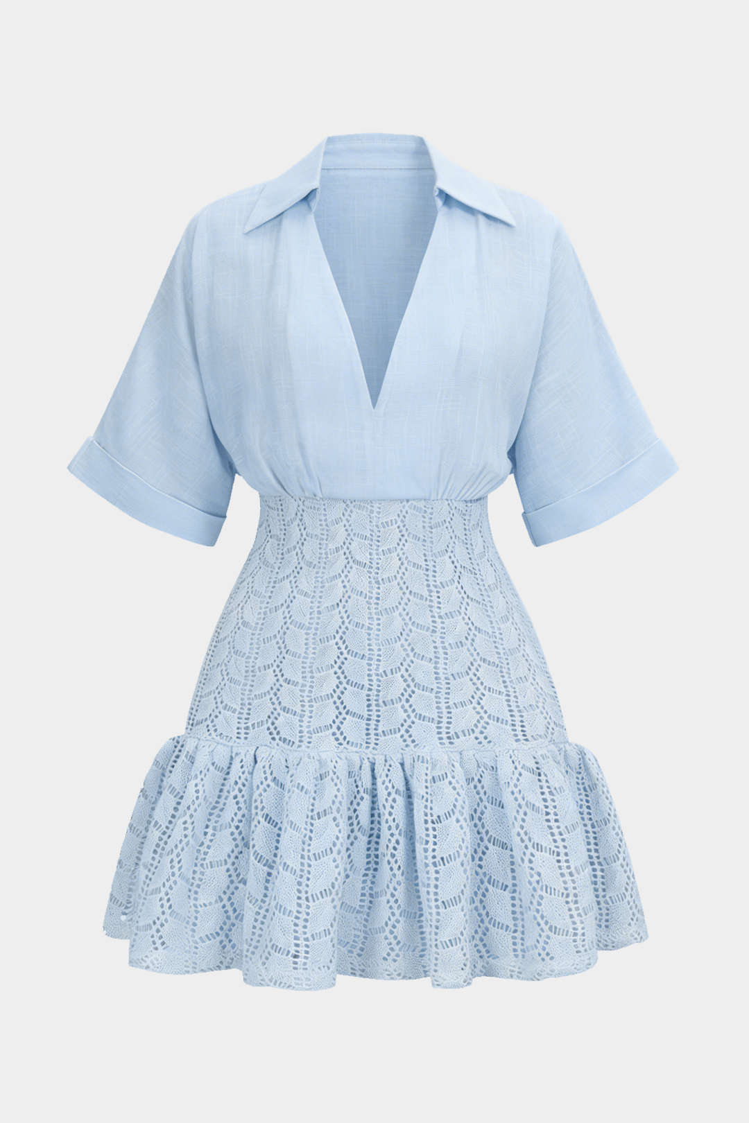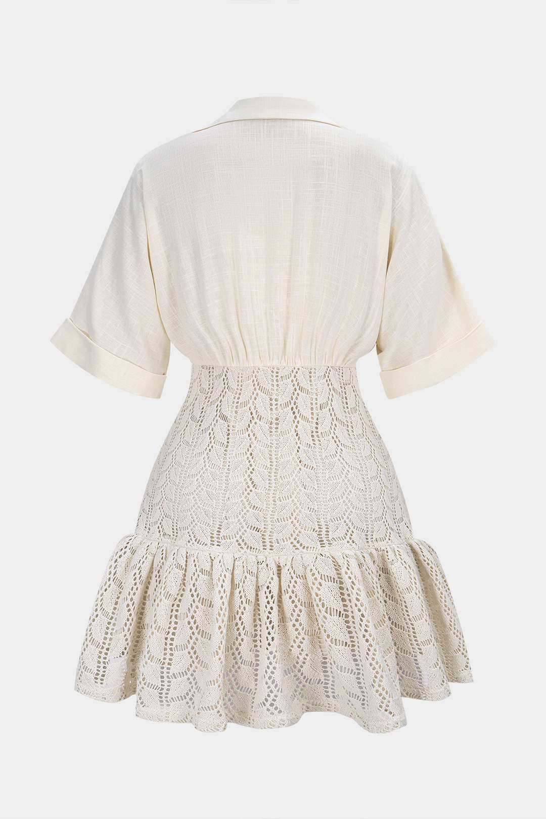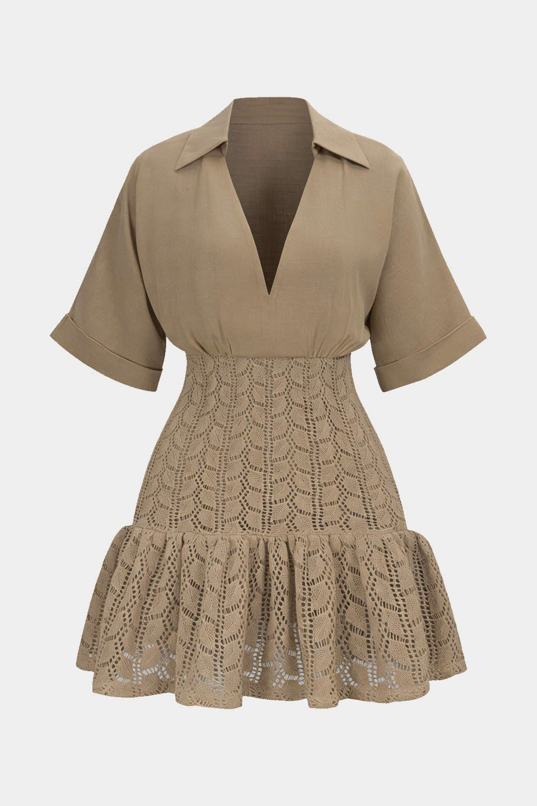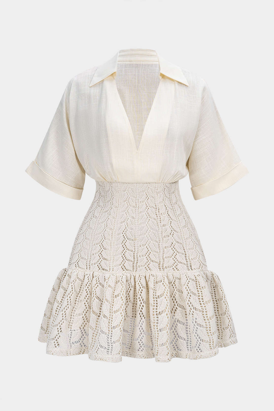 Jacquard Patchwork Linen Ruched V-Neck Short Sleeve Mini Dress